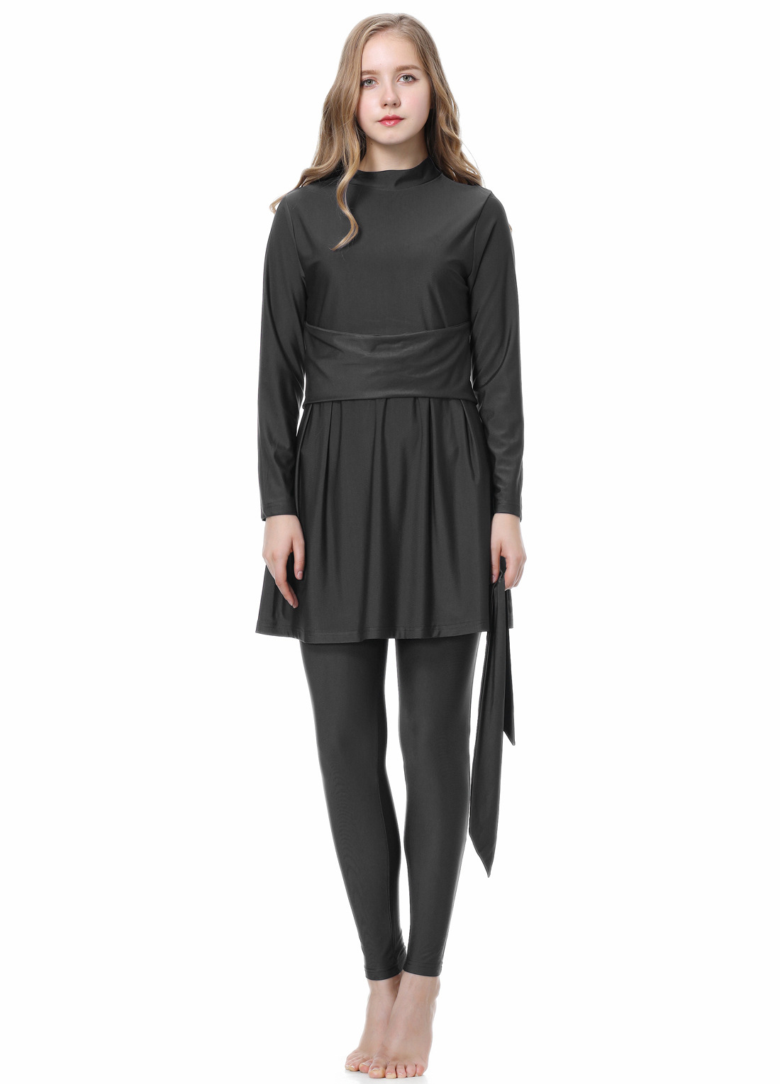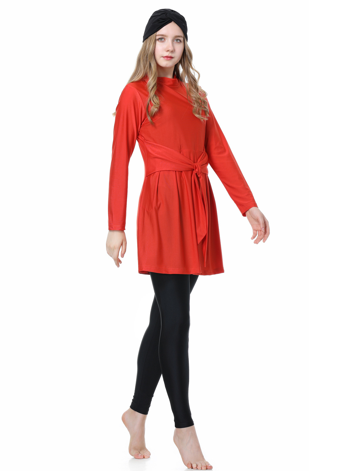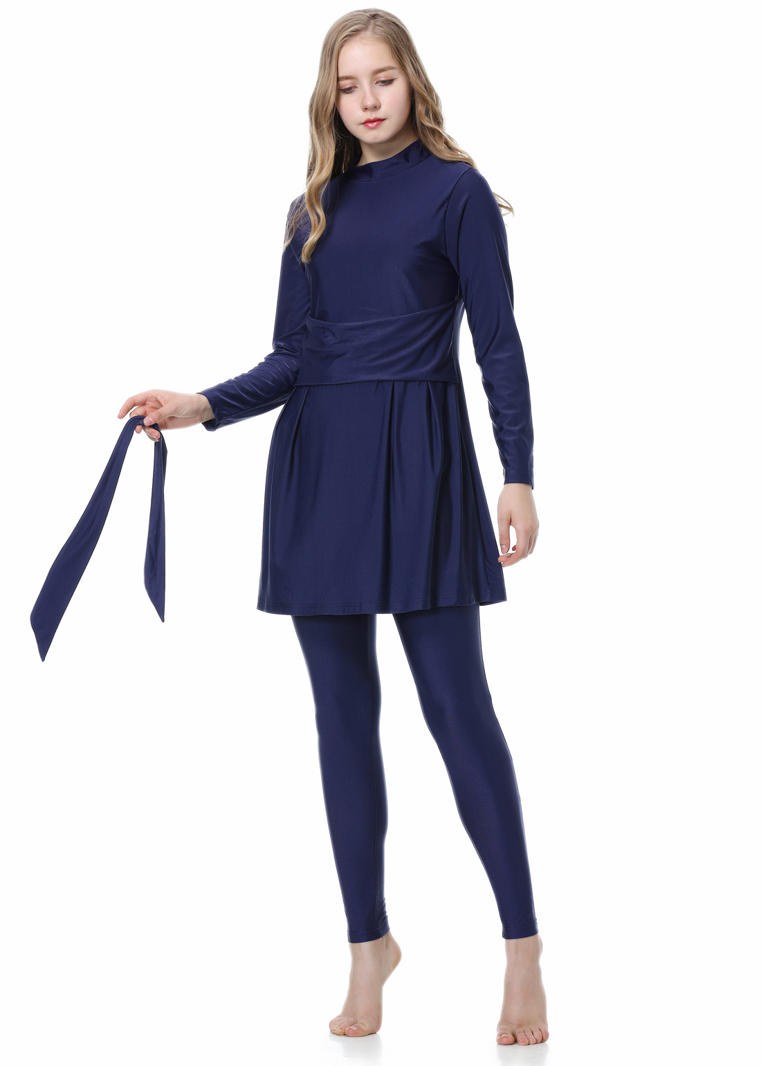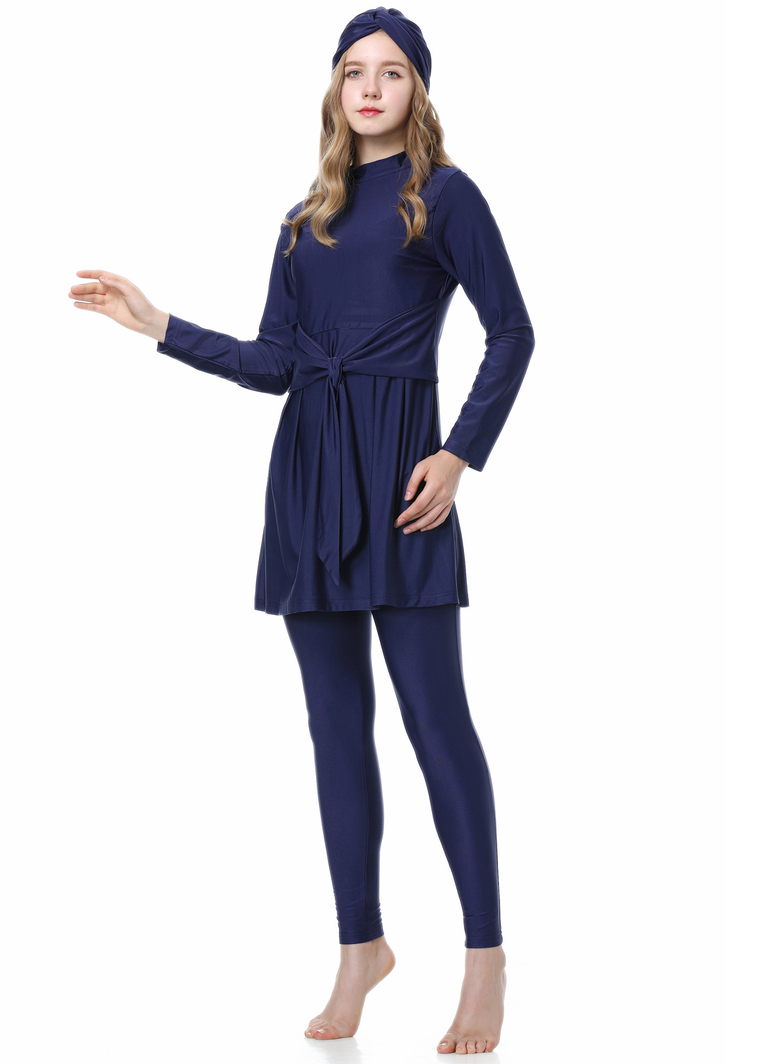 Dive into comfort and confidence with our Modest Burkini Muslim Swimwear 3-Piece Set, designed for full coverage, sun protection, and graceful style. Perfect for Muslim women, this set includes a long-sleeve tunic top with a flattering front tie, full-length leggings, and a coordinating turban-style hijab swim cap.